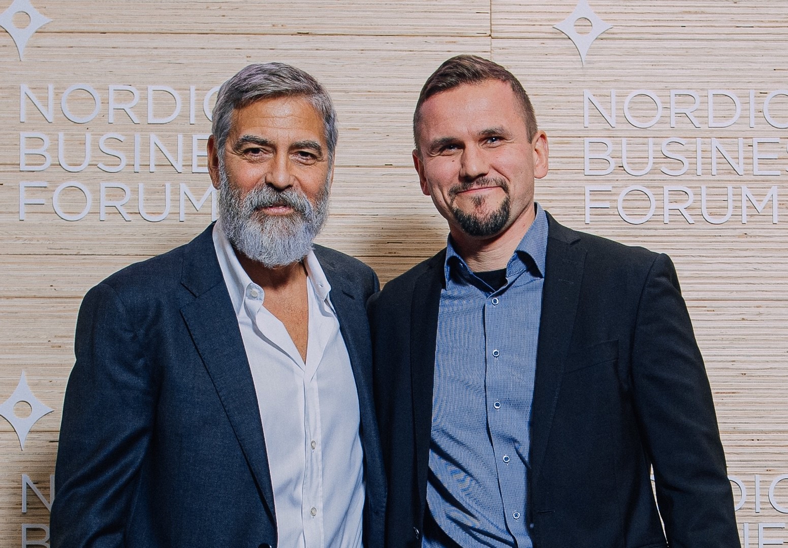 Kuva: George Clooney ja Timo Metsola Nordic Business Forum –tapahtumassa 2019. (Kuva: Nordic Business Forum)