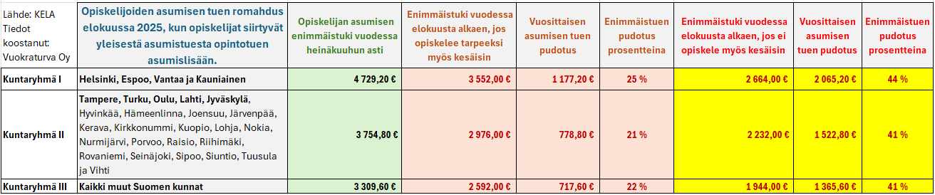 Helsingissä, Espoossa, Vantaalla tai Kauniaisissa opiskelevien asumisen tuet romahtavat vuositasolla 25 % niillä, jotka opiskelevat täysillä myös läpi kesän, ja normaaliin tapaan yhdeksän kuukautta vuodessa opiskelevilla asumisen tukien romahdus on peräti 44 %.